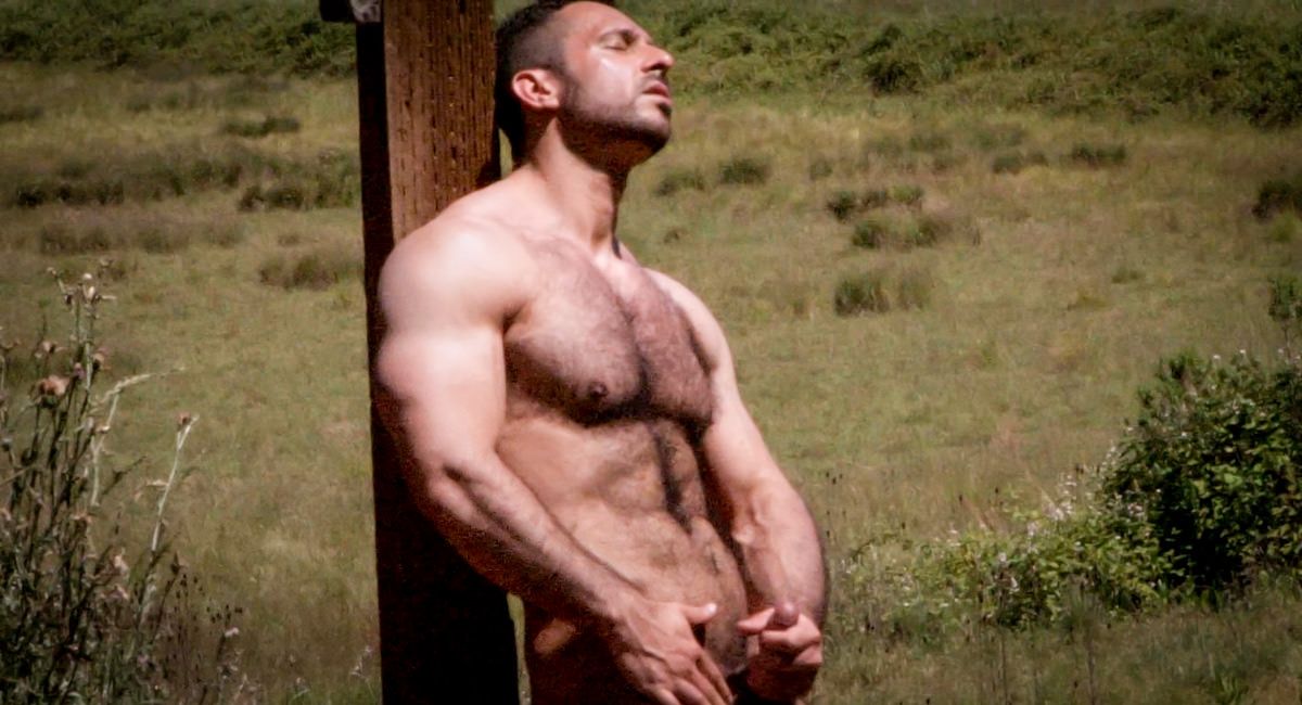Masculine, hairy and beefy Adam Champ approaches the stableswearing his cowboy hat and an open flannel shirt. He surveys thelandscape to find that he's the only one around. He rubs on his furrychest and flexes his muscles wishing he had another rancher to playwith. Since he's by himself, he can't wait any longer and he pullsdown his pants to feel his ass and cock. He likes the way his meaty,fuzzy ass feels when he rubs it. Getting himself super aroused hepulls his pants all the way down and jacks away as he continues tofeel himself up. His uncut meat feels great in his hand and leads himto start jerking faster until he blasts streams of cum.