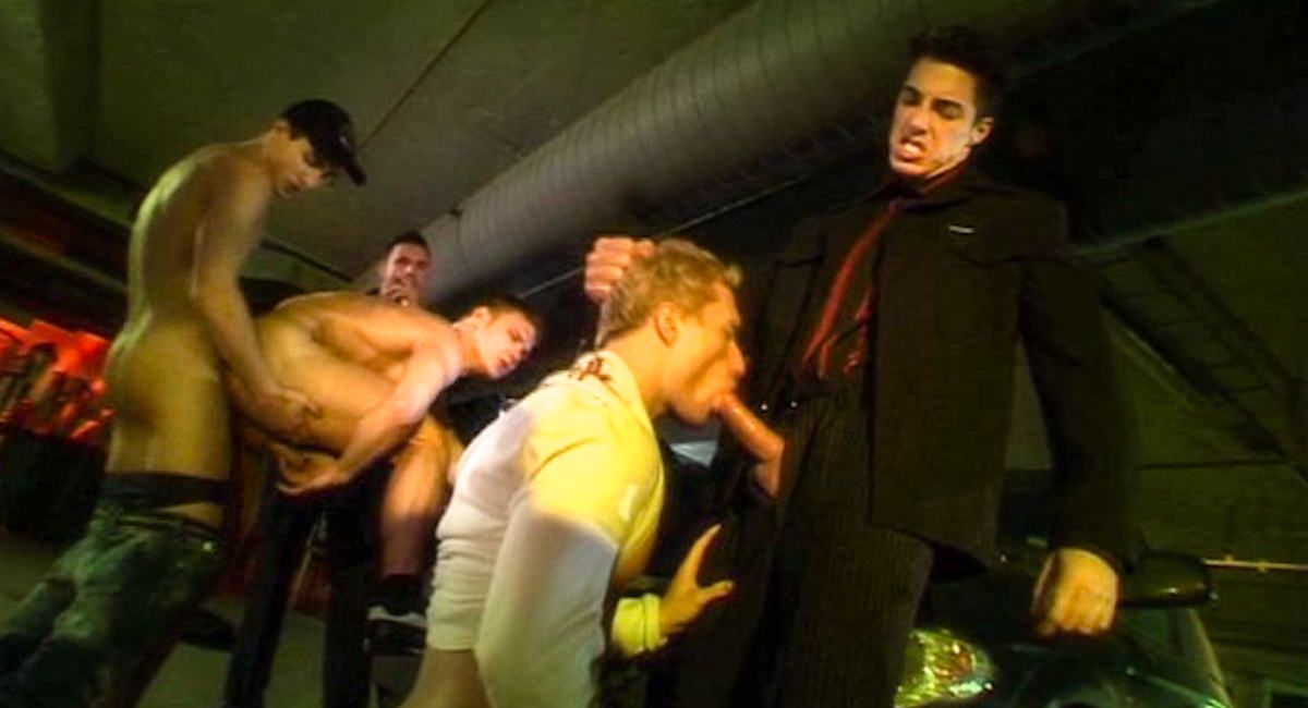 With junior mobsters Michael Kozec and Jose Scott helping, JulianVincenzo and Lucio Maverick get their jollies tormenting Drago Lembeck, who is made to suck cocks through a hole in the bagcovering his head. Michael and Jose prove to be master ass drillers,gouging Drago's fuck hole. In an incredibly hot facial cum shot, Dragoflinches at the strength of Michael's creamy spray all over his kisser.