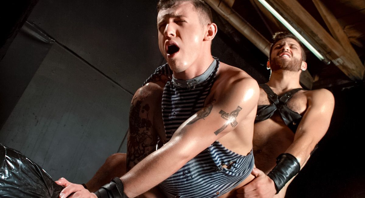 Tommy Defendi takes possession of James Ryder. Looking deeply into James' eyes, as if casting a spell, he pushes James' jeans down and jams a finger into his ass. James may look like a punk, but his wide hazel eyes hint at innocence. Tommy snarls, kissing him roughly and clasping their cocks into a single massive shaft. Mesmerized, James kneels and sucks. It's more than enough for one mouth, but with a combination of desire and spit, he succeeds in swallowing it. James squeezes Tommy's balls while pumping his own big cock. Tommy then targets James' ass. A cock as fat as Tommy's seems like it will never fit in James' tight butt. But that doesn't stop him. He grabs James by the back of the neck and pushes until the walls of James' hole part. James closes his eyes, engulfed by white heat as he is breached by ten thick inches of hard flesh and pounded. James then lies on his back spreading his legs wide. Tommy keeps his hole lubed with spit and his tongue as he sucks James' nice inches of throbbing meat then fucks him some more. When they both climax, it's like a dam bursting.