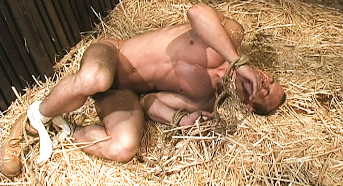 In a dreamlike barn setting, Robert Black jacks his cock in the shadows while Sky Donovan appears to relax amidst bales of straw. As in a dream, Sky suddenly finds himself bound against the supports of a corrugated tin wall...ass bare and exposed...t-shirt in tatters. Robert Black flogs Sky's ass again and again...over and over until it glows red. Then Robert rips of Sky's T and starts shreddingSky's back...beating him again and again until Sky's back is rosy and swollen. Robert douses Sky with liquid, then leaves him to stand and endure the sting of his tender flesh before torturing Sky once again with fragments of straw...each one burning a painful trail in his raw flesh. Finally Sky's hands are freed and he drops exhausted into the straw.