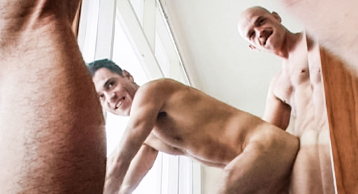 Lance Gear gets cruised by Drake Romano in Sydney Harbor, as thetwo paddle canoes around. Drake invites Lance up to his place, whichhas a beautiful view, and the two studs rival it for attention when theyget down to business. Drake gets Gear's gear off in a hurry (it's only aSpeedo, after all), and immediately goes down on him, then Geargets a face full of Drake's uncut dick. Drake then fucks Lance doggy,his hard pecs and ridged abs standing out in relief as he thrusts.Then the two switch off and Lance is fucking Drake from behind.Before they're done, they switch again, this time with Lance getting itmissionary from Drake (so hard, in fact, that I was worried aboutLance getting rug burn). Drake lets fly a huge load that jets overLance's head and drips onto his waiting tongue, then Lance strokesoff, leaving his load all over his torso and lower belly.