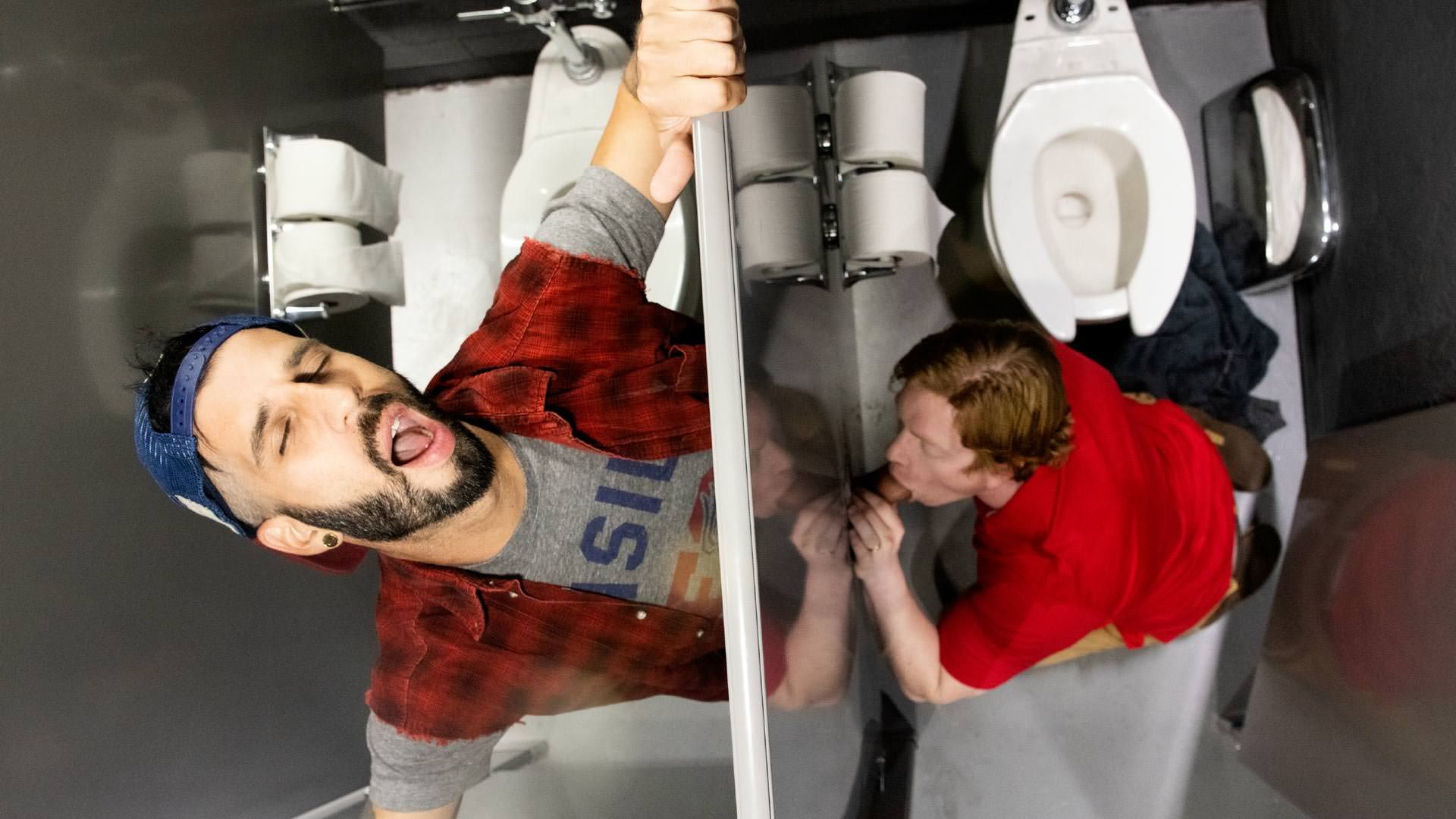 Romeo Davis is cruising at the urinals of the public restroom when Kyle Connors slips off his wedding band and notices Romeo's throbbing uncut member. Kyle quickly reaches over to grab a hefty handful. For a little more privacy, they each enter a separate stall and use the gloryhole. Romeo slides his dick through, and it's met with Kyle's warm, wet mouth. Kyle proves he's a hungry little cock slut as ropes of spit hang from his chin and Romeo's cock. When Kyle's throat needs a break, he slides his cock through the hole to let Romeo return the favor. After sucking on Kyle's meat, Romeo wants hole, so Kyle backs up as Romeo's inches disappear inside Kyle's ass. Kyle wants to feel the fullness of Romeo's cock, so he joins Romeo in the stall and braces on the toilet while Romeo pounds him bareback from behind. Switching positions, Romeo sits down on the toilet and Kyle sinks down on the fat cock and rides it hard. After bouncing on Romeo's cock, Kyle bends over one last time to get his load pounded out of him. It lands all over the floor. Romeo follows, delivering a heavy load to Kyle's face and mouth.