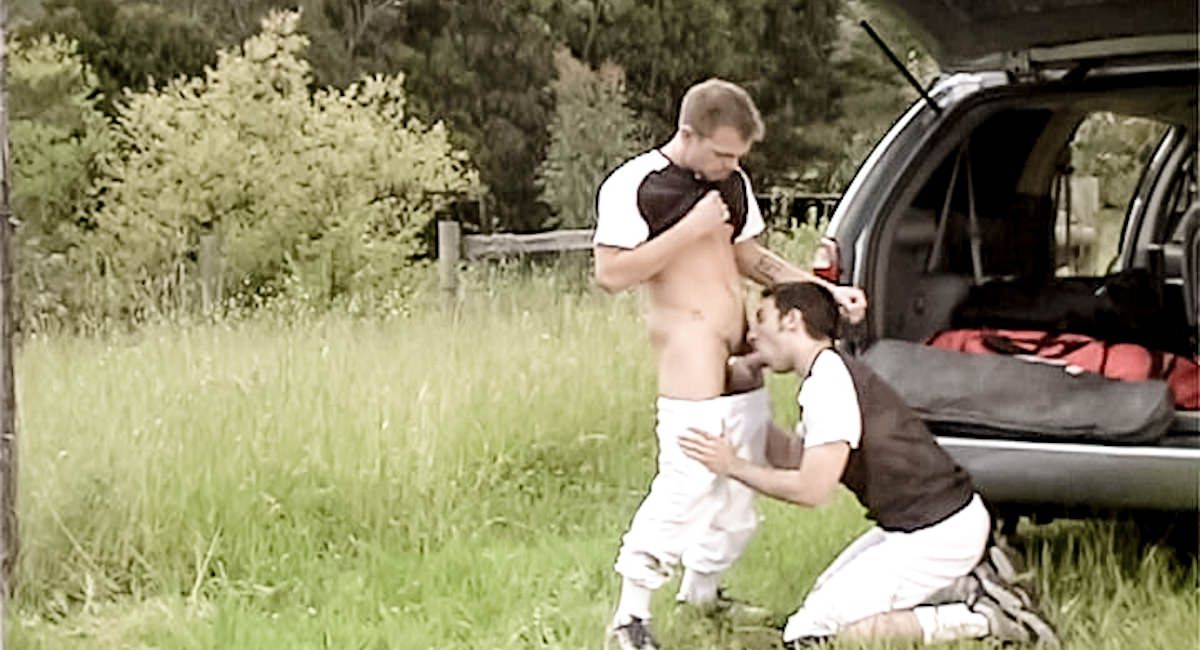 Tan Bender makes the mistake of coming on to the ever-horny JacobSlader. Moments after Tan offers his teammate a crack at his ass,Jacob pulls the car off the road and devours him. Jacob takes thelead, stripping down completely next to the abandoned car, letting Tansavor his long rod. I'll never tire of Jacob's thick and lovely prick. Nomatter who's enjoying it at the moment, this is one cock that neverloses its visual appeal. Fucking in the back of the minivan, it's easy tosee why the hatchback was invented. Tan is submissive, letting Jacobmaster him completely. Several times during their anal session, Jacobroughly grabs Tan by the hip joints and moves him into better positionbefore digging back into Tan's gaping hole. Tan is a leaker, thinstrands of juice creating a fine web between his cock and his belly.